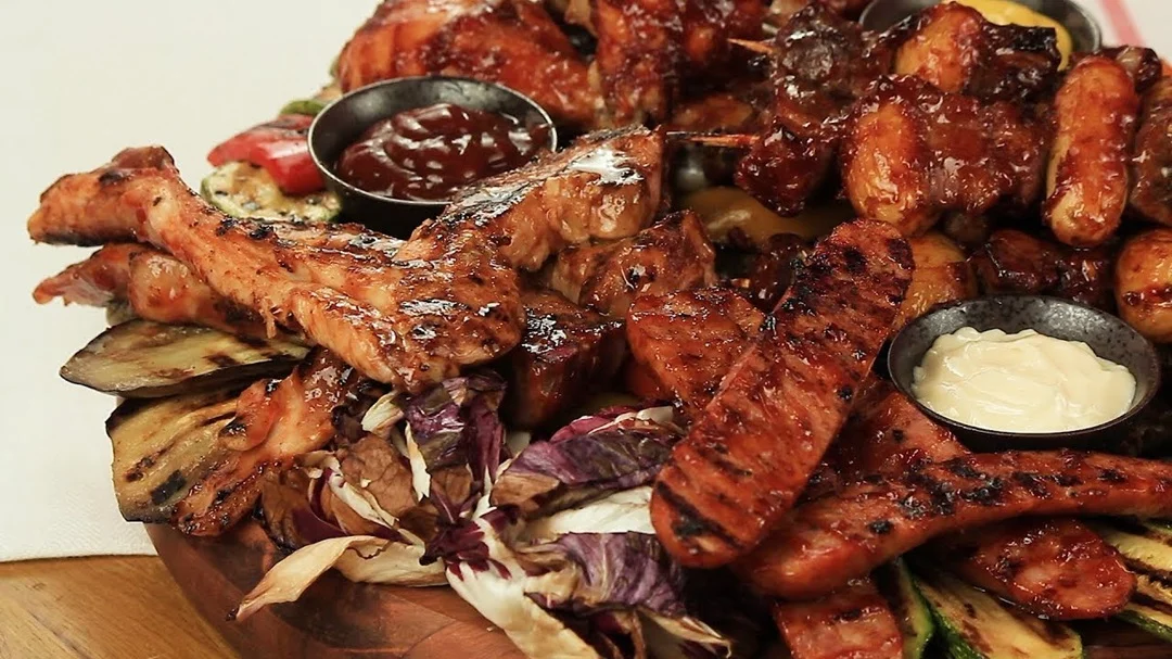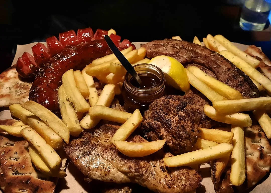 2 καλαμάκια χοιρινά, 2 λουκάνικα χωριάτικα,